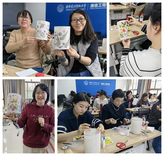 女教工们在指导老师的帮助下,动手精选各式干花干草,运用压花技艺,保留大自然的细腻与柔美。将压花艺术融入小夜灯设计,创造既实用又美观的个性灯具。每一盏小夜灯都将成为家中一抹温馨的光影,讲述着关于自然与爱的故事。
