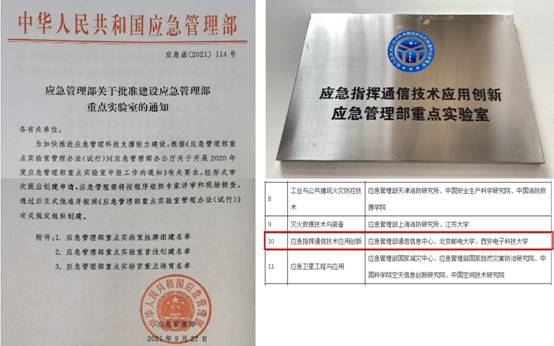“应急指挥通信技术应用创新应急管理部重点实验室”为应急管理而建,为应急管理而用,是应急管理部应急通信方面唯一重点实验室。西电作为主任轮值单位之一,充分发挥优势和特长,与应管理部通信信息中心、北京邮电大学共同围绕数字化应急通导一体化展开深入研究。
