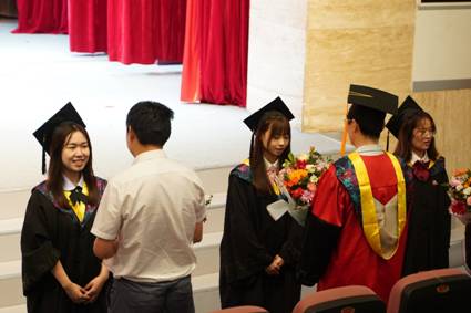 教师代表秦凡在发言中希望同学们保持学习劲头,找准人生赛道,不计一时得失。随后,毕业生代表向参加授位仪式的各位导师献花,表达对师长培育之恩的真挚感谢。