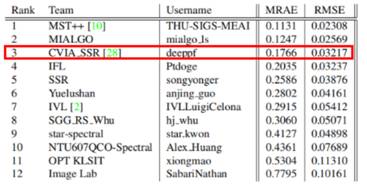 NTIRE是近年来计算机图像恢复领域最具影响力的全球性赛事之一,致力于推动退化图像内容恢复、缺失信息填补等图像处理关键问题的演进,面向实际工程应用场景提出优秀解决方案。其中,光谱重建赛道旨在通过单张RGB图像作为输入,通过构建深度神经网络生成对应的具有31通道的高光谱图像。NTIRE已成功举办六届挑战赛,是国际范围内最具影响力的视频和图像复原竞赛。本次光谱重建竞赛由苏黎世联邦理工学院作为主办方,吸引了来自包括h漫