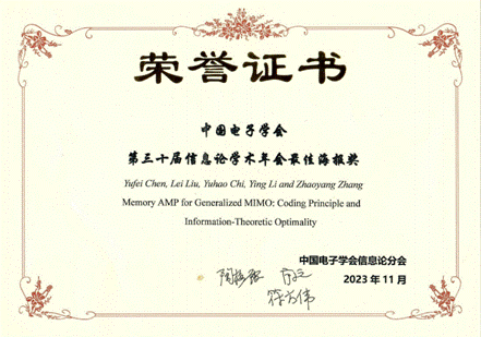 另外,由我院李颖教授指导,池育浩老师协助指导的博士生陈宇飞以第一作者完成的“Memory AMP for Generalized MIMO: Coding Principle and Information-Theoretic Optimality”获得此次会议的最佳海报奖。该项工作提出了大规模MIMO下低复杂度且约束容量最优的MAMP接收机和最优编码设计准则,解决了MAMP高维状态演进难以分析信息理论极限的难题,表明了最优编码下的MAMP接收机能够达到最优OAMP接收机的性能,并且复杂度能降低至OAMP的0.4%左右,同时也揭示了贝叶斯最优接收机与点对点信道编码方案直接结合不再是最优方案。